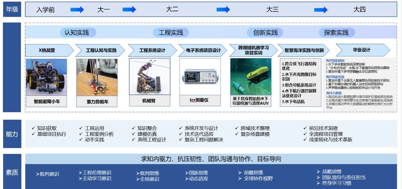 未来技术学院以智慧海洋科技项目为实践载体,构建 “兴趣激发—基础夯实—学科交叉 —前沿突破” 四阶递进培养架构,打造 “全贯通、立体化” 项目制课程体系。体系下设认知实践、工程实践、创新实践、探索实践4个模块,覆盖大一至大四全学段,形成 “能力—素质双维耦合” 的新工科人才培养范式,实现从知识建构到科研攻关的全链条培养闭环。